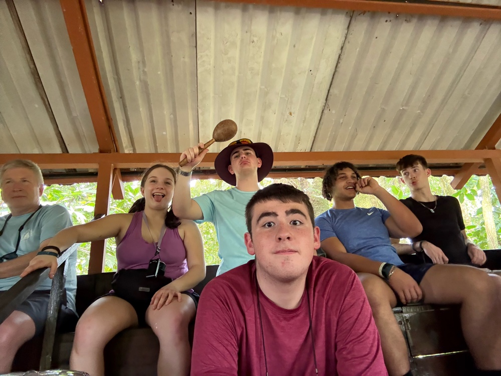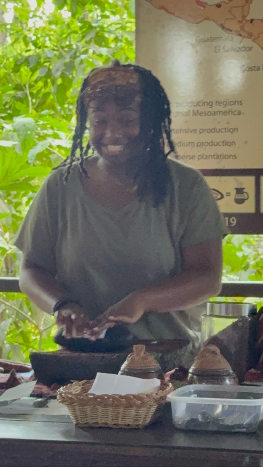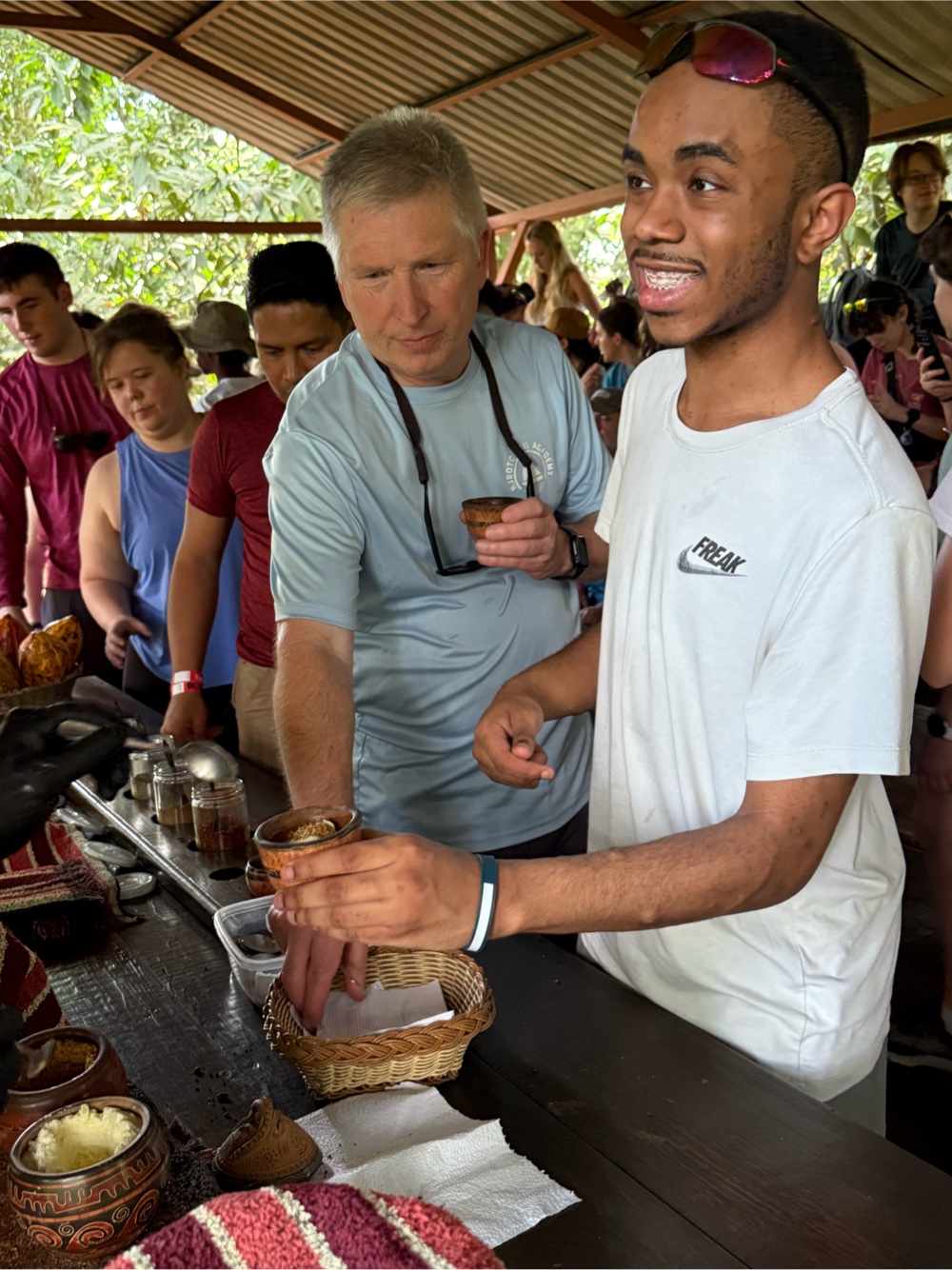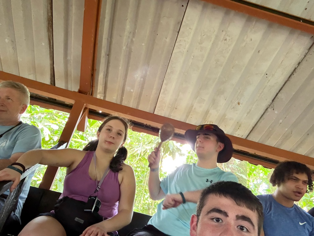 While grinding, our guide added cinnamon and sugar. Both melted into the paste and changed the smell immediately. Several students got to try their hand at making the paste and further grinding the nibs. The kids had to “dance” while doing it because that’s how it was traditionally done, so several of our students took that job very seriously while others provided the music.