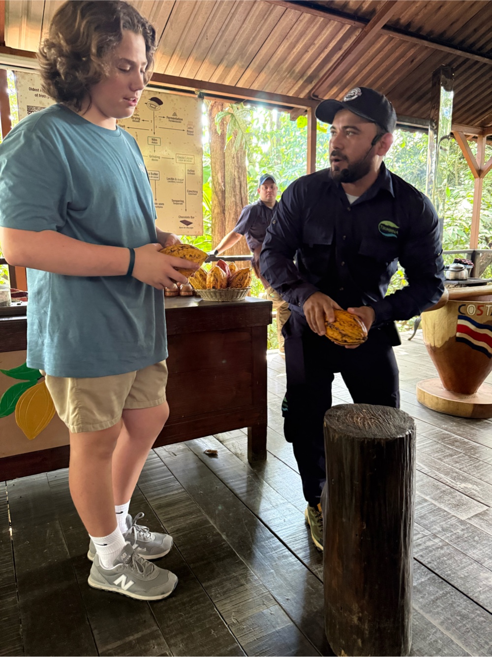 Cacao trees grow best in shade, so farmers plant them under bananas or other taller crops. When the pods ripen they turn yellow, orange, or red depending on the variety. Our guide had the kids guess how many seeds are inside. Guesses were all over the place. Most pods hold around 30 to 60 seeds.