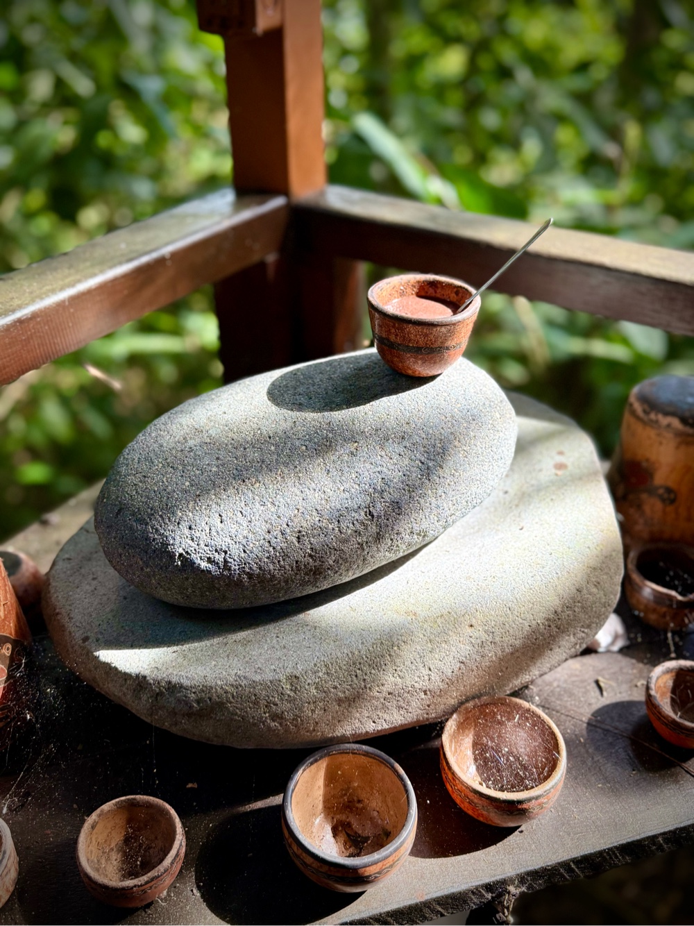 Grinding the nibs on a heated stone turns them into a paste. The friction heats the stone fast, so by the time we were working the nibs, the rock was almost too hot to touch on the edges.