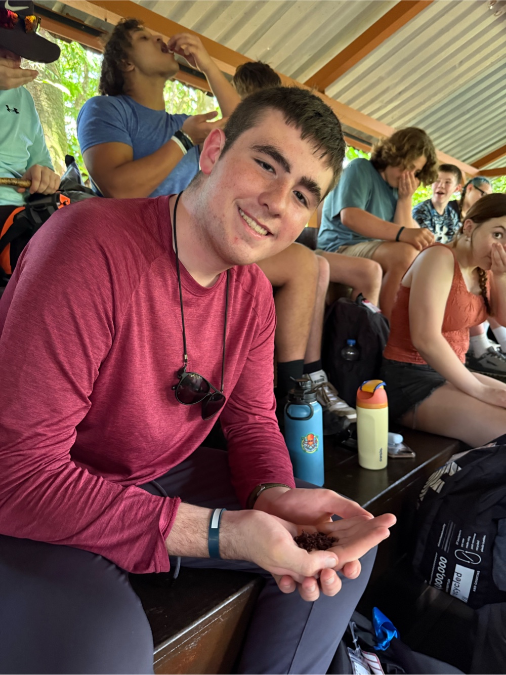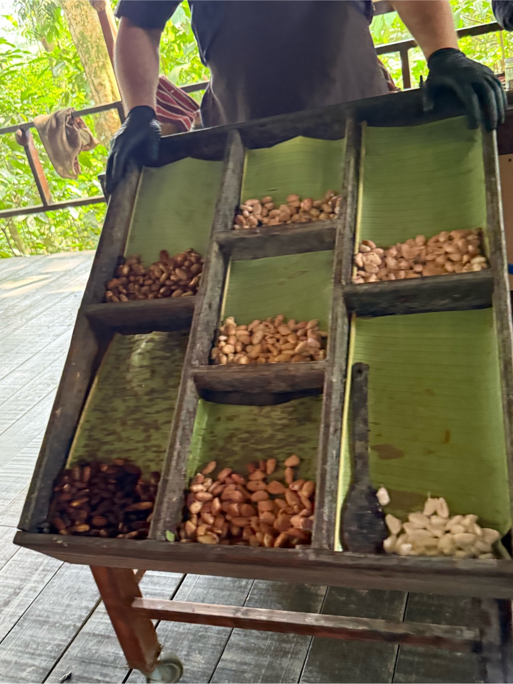 Once the seeds are scooped out, the real work starts. They have to ferment to develop any chocolate flavor. Fermentation darkens the seeds, creates heat, and starts to produce the smell everyone associates with chocolate. After that they dry for 8 to 12 days using boxes that are rotated between sun and rain locations. When you open a batch after drying, the aroma finally starts to make sense. We smelled this stage.