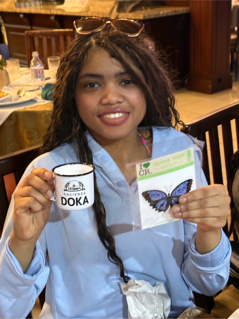 Mya is taking home a beautiful butterfly sticker from the coffee plantation we visited yesterday as well as one of the tasting cups for the coffee.