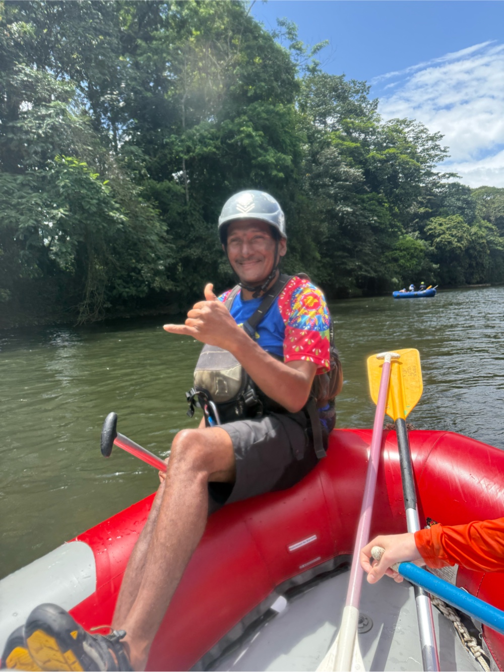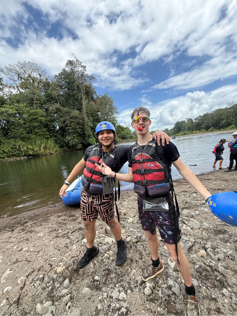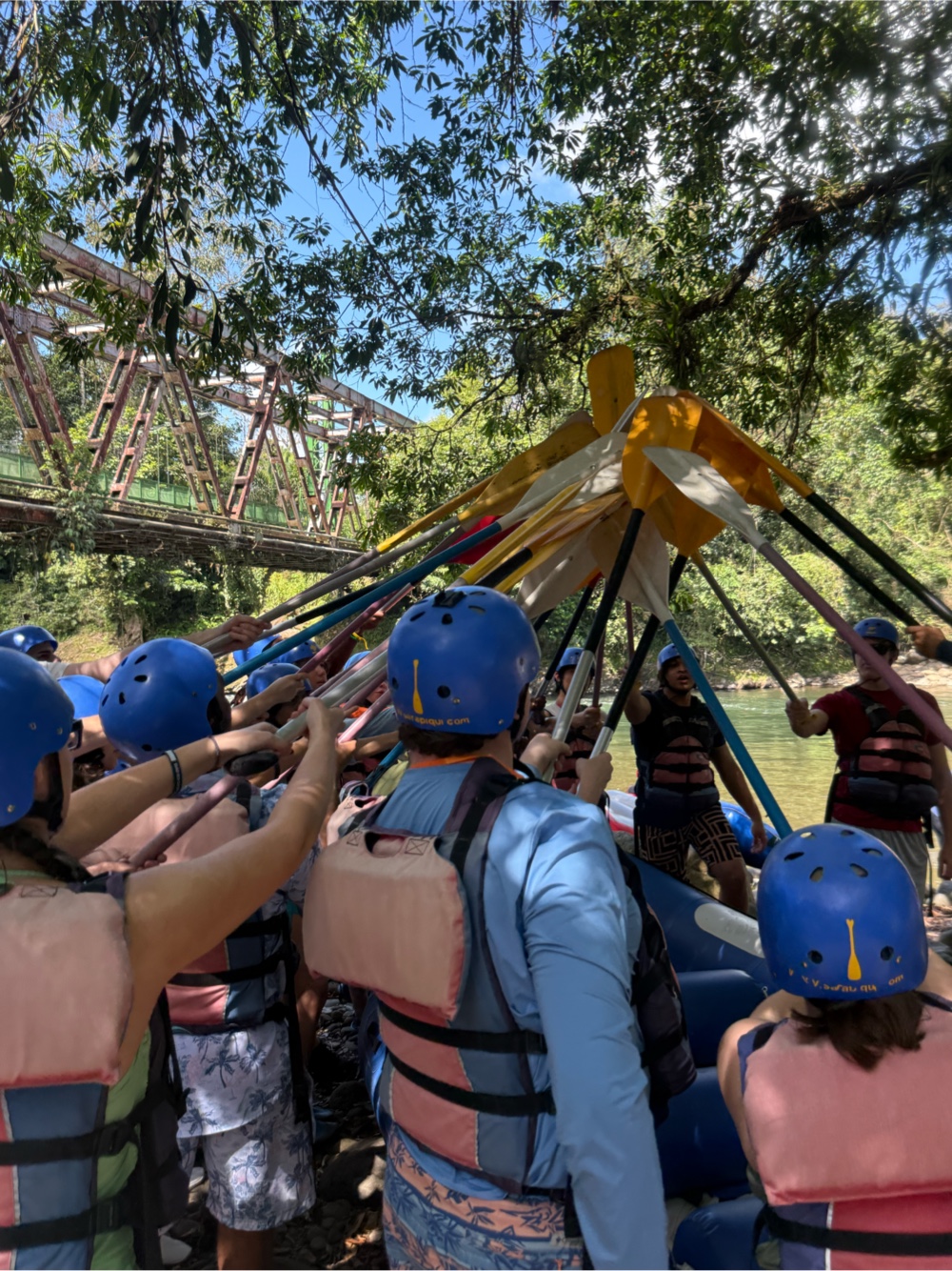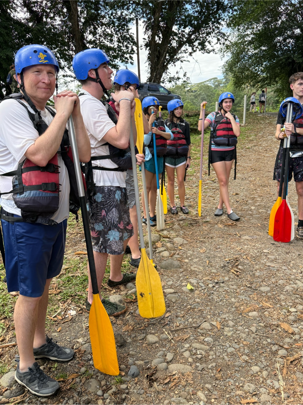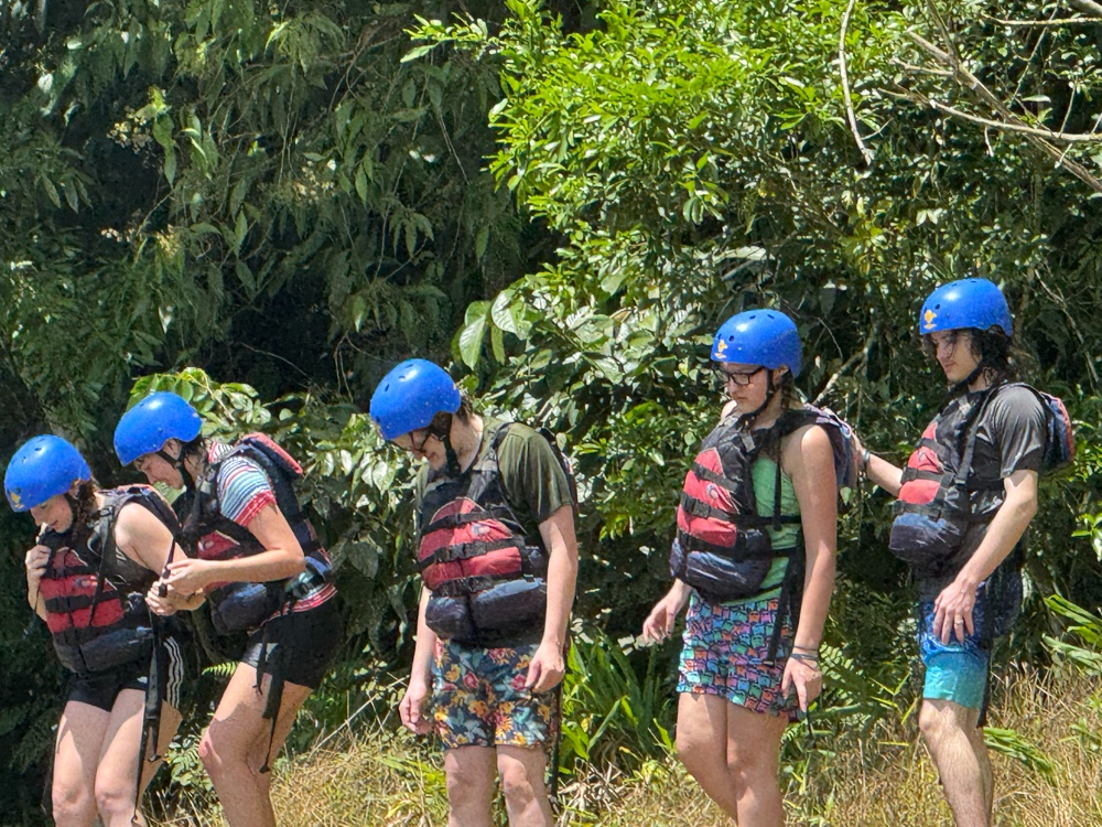 First stop was getting finalized clothing and leaving everything in the bus. Then it was back in the bus for about 10 minutes to take us to the drop off point. We will end up back at the headquarters once we are finished making our way down the river. Everyone got suited up with oars, helmets and life vests. Then we had a brief explanation of how to paddle, pull people in, switch positions in the boat, and how to stay safe.